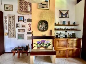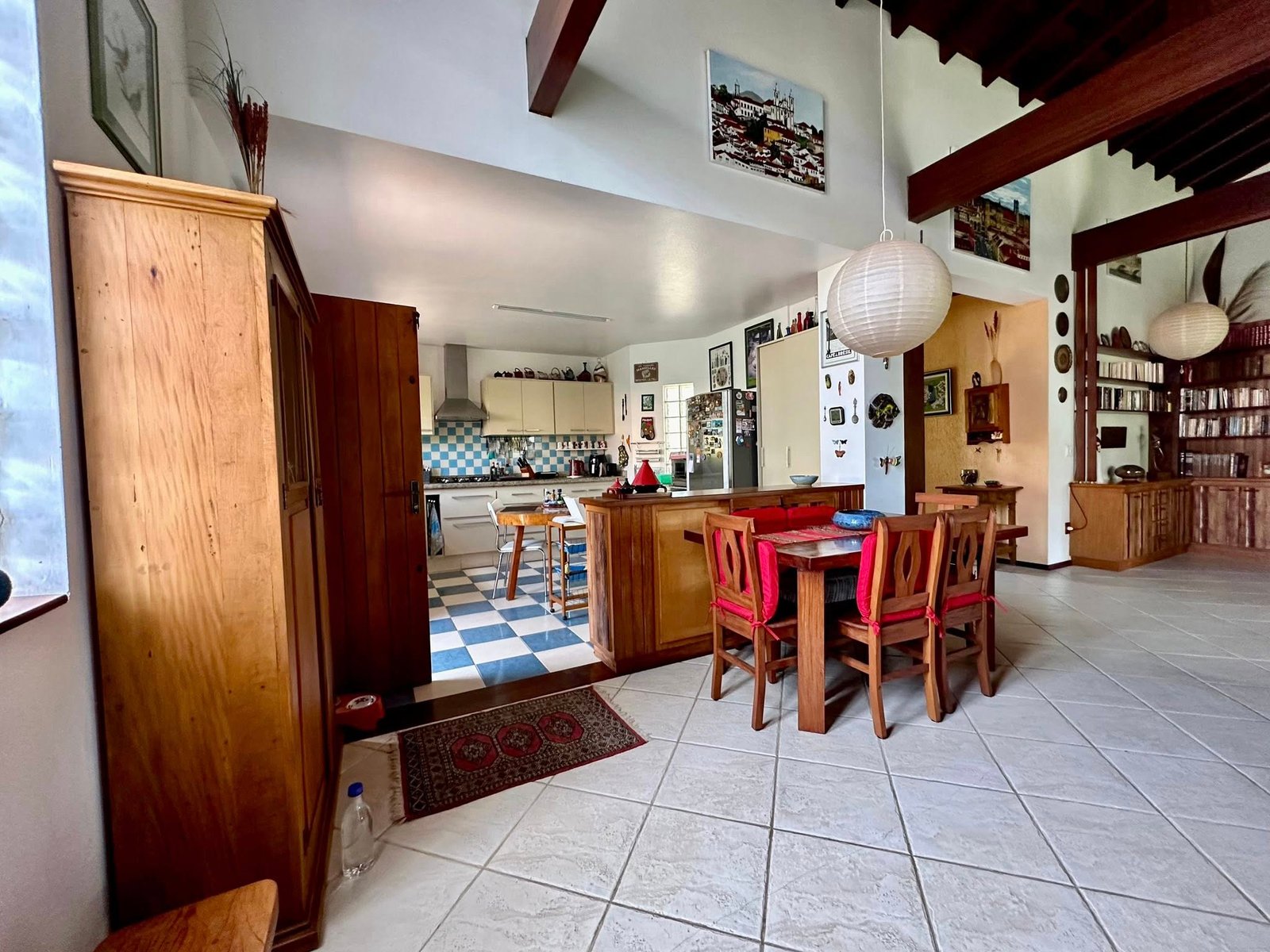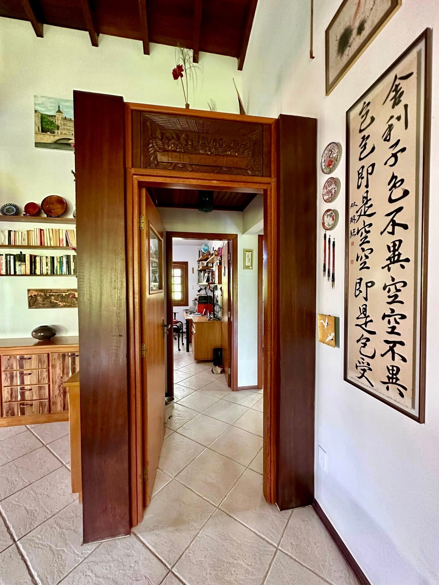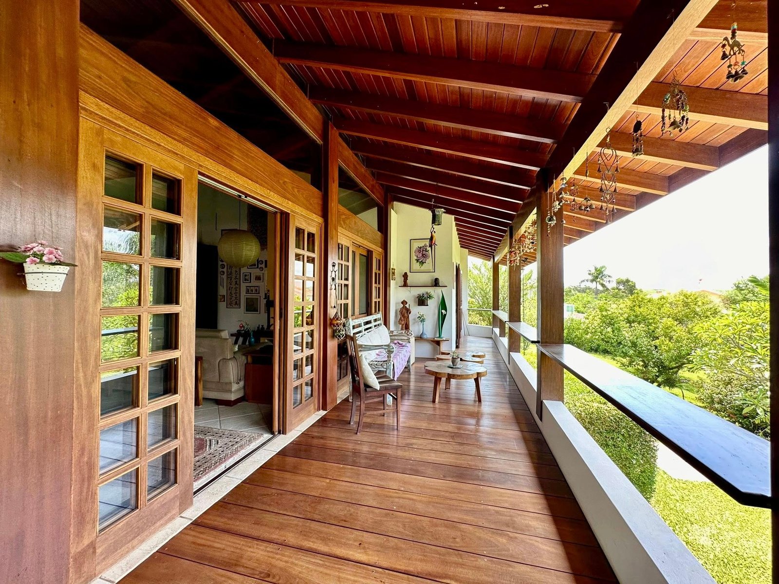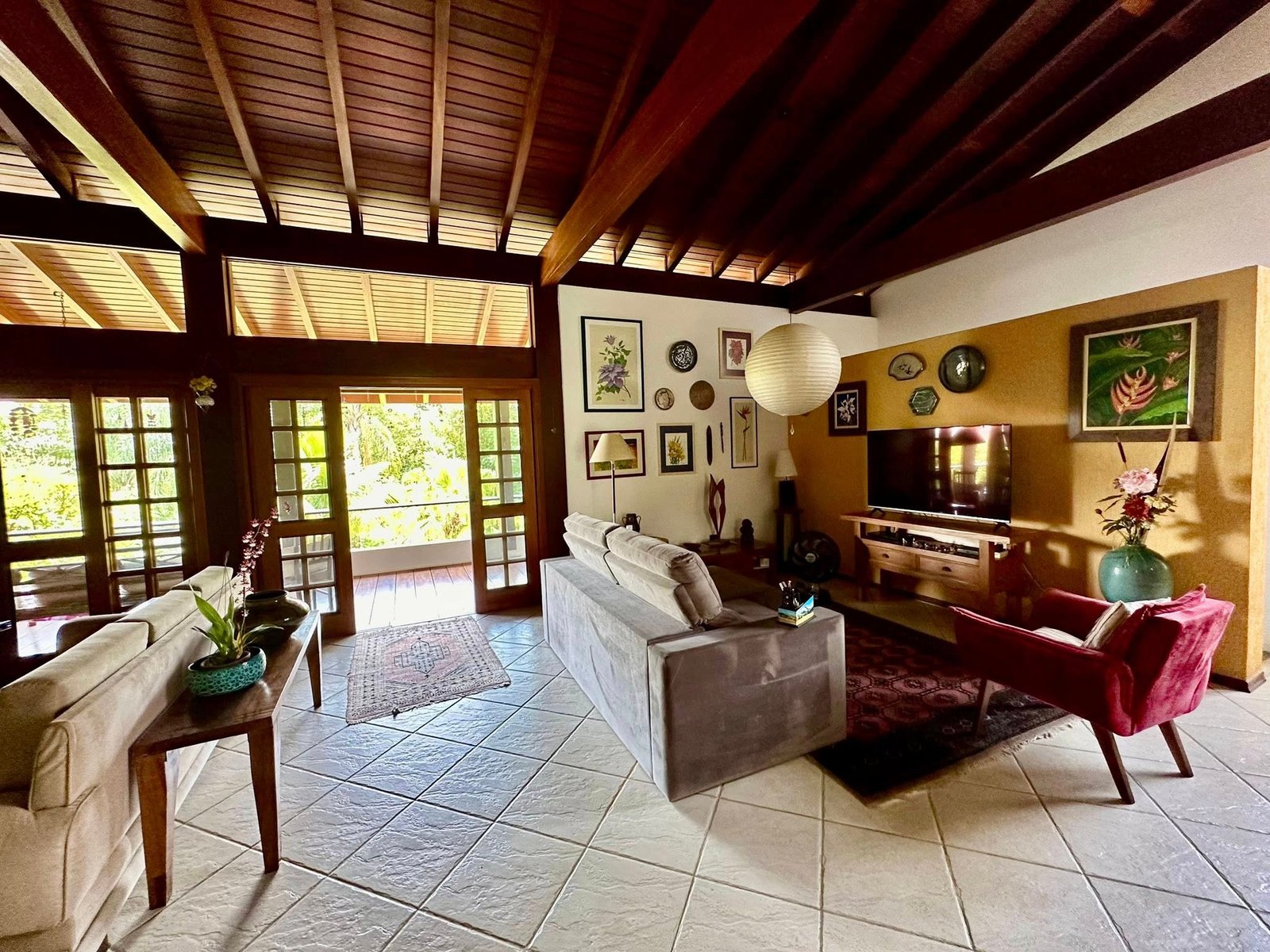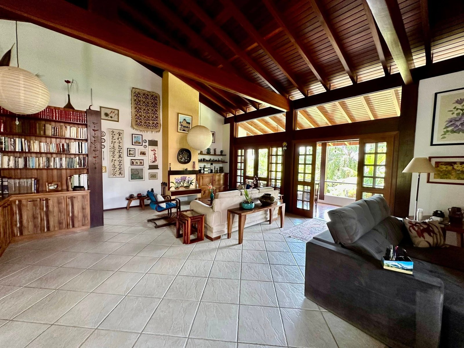 ✔ Sala ampla com pé-direito alto em madeira de lei e lareira